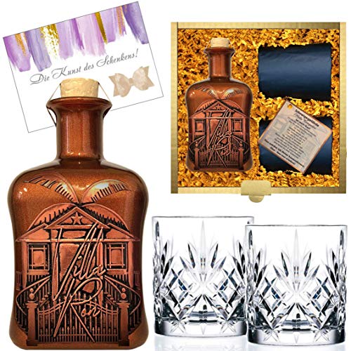 Geschenkset: eine Flasche Villa Ron Spiced Rum (0,5 l) unter Einsatz von 2 edlen Rum-Tumblern, geschliffen außerdem unter Einsatz von schwerem Boden