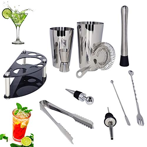 10pc 550ml-Rack: 1 x 550ml Shaker, 1 x Muddler, 1 x Sieb, 1 x Eiszangen, 1 x Löffel & Gabel, 1 x Ausgieß, 1 x 15 / 30ml doppelseitiger Jigger, 1 x Kork.1 x Rührstab, 1 x Getränkrezept, 1 x schwarzer Cocktailständer.
