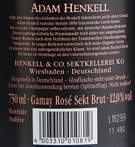Mehr zum Sekt von ADAM HENKELL Adam Henkell ist positioniert als die Prestige-Gamay-Cuvée im Premiummarkt. Der Sekt, der den Namen des Firmengründers trägt, bekennt sich zu höchster Qualität. Die erlesenen Gamay-Trauben stammen seit jeher von einer sehr kleinen Weinbauregion jeder Lothringen. Die speziell für den Adam Henkell Rosé ausgewählten Gamay-Trauben verleihen diesem nach dem Verfahren der Traditionellen Flaschengärung hergestellten Sekt seinen außergewöhnlichen Charakter. Das moderne, exklusive Ausstattungsdesign überzeugt mit prägnanter Eleganz und einem starken Markenauftritt. Mehr zur Geschichte von ADAM HENKELL Der Mainzer Weinhändler Adam Henkell begann 1856 mit der Herstellung von hervorragenden Sekten. Indes kombinierte er französische Cuvéekunst und deutsche Kellermeisterkunst. Seinem Enkel Otto gelang gegen Ergebnis des 19. Jahrhunderts der Durchbruch auf dem nationalen und internationalen Marktgebiet und wohl mit dem ersten Markensekt – Henkell Trocken. 1909 zog die Kellerei von Mainz nach Wiesbaden und ist neben diesem Stammsitz mit eigenen Tochterunternehmen in weiteren 30 Ländern vertreten.
