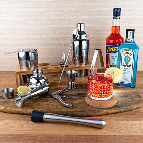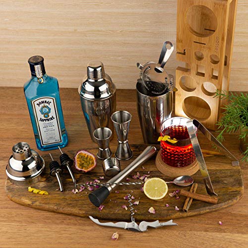 15-teiliges Barkeeper-Set: 1 x 750 ml Getränke-Shaker für hohe Getränke, und 1 x 510 ml Margarita-Shaker für kürzere Cocktails, 2 x Cobbler Shaker-Deckel, 2 x Duplikat-Cocktail-Messbecher – 0,2 l, 28,3 g, 24,1 g und 48,2 g. Korkenziehermesser IFE, (2) Likör-Flaschenausgießer, (1) Hawthorne-Sieb, (1) Cocktail-Stößel, (1) Langbar-Löffel, (1) Reise-Cocktail-Set-Tasche, (1) Mini-Zange (1) Bambus-Ständer