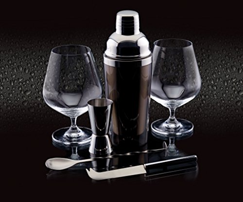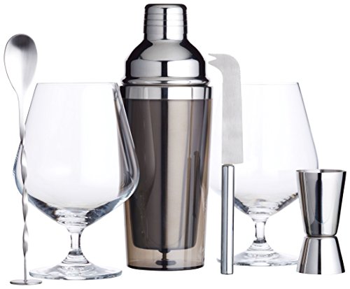 Alles was Sie brauchen, um die Mixologie zu beherrschen: Ein Cocktail-Shaker, ein Cocktail-Rührlöffel, ein doppelseitiges Barmaß, ein Barmesser und zwei Gin-Gläser