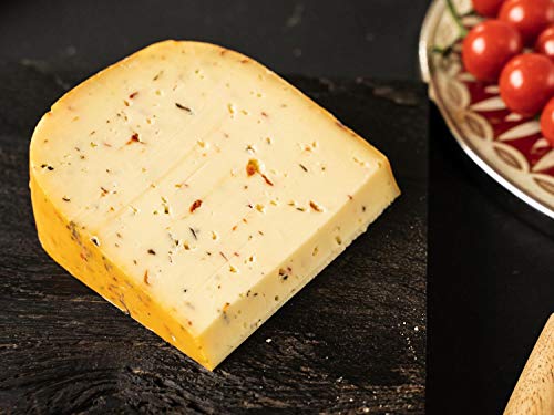 Verfeinert mit Tomate, italienischen Kräutern und ein paar Oliven. Ungefähr 5 Monate gereift.