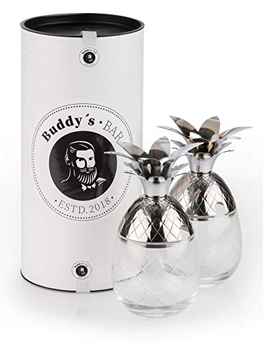 Buddy´s Bar – 2 Ananas Cocktail Becher, 350 ml, Pineapple Mug, hochwertiger Edelstahl-Becher mit Glas-Element, lebensmittelecht, Cocktail-Becher inkl. Geschenkbox, 2 Stück, Edelstahl/Glas