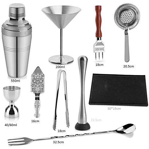 [Komplette Bar Set] Cocktailglas Set kann alle Ihre Anforderungen abschließen! Das Kit enthält ①550ML Shaker②200ml Cocktail-Glas③Three-Head-Eis-Kegel-Sieb-Massiv-Tasse (40/60ml) ⑥absinthhe-Löffel-Löffel-Löffel-Löffel-SPOOn⑩Bar-Matte (Gummi).