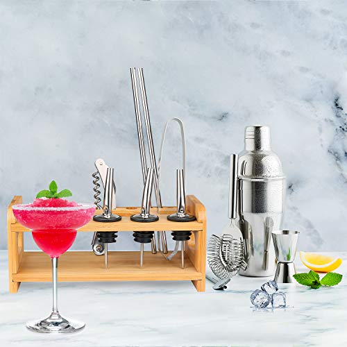 Hochwertiger Bambus-Ständer erleichtert die Aufbewahrung und das Herumgammeln des Cocktail-Sets.