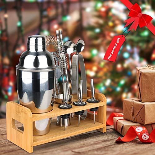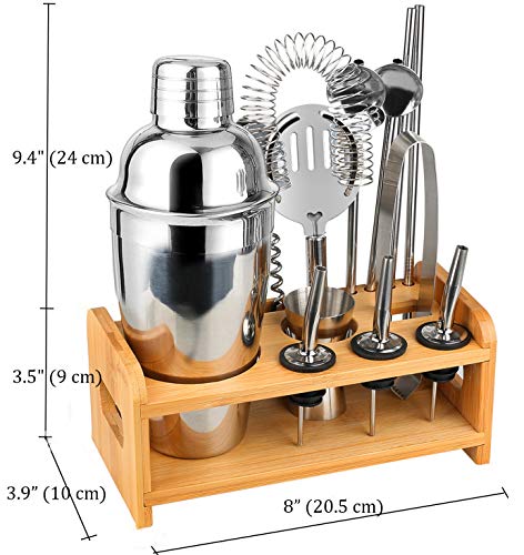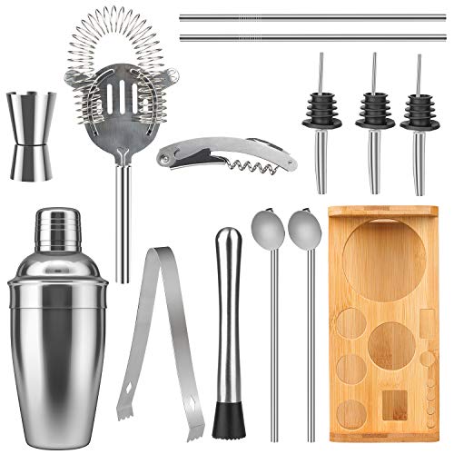 13 + 1 Cocktail-Shaker-Set: Dieses Barkeeper-Set enthält 1 x 550 ml Cocktail-Shaker, 1 x Bambus-Ständer, 1 x Sieb, 2 x Rührlöffel, 1 x Messbecher, 1 x Korkenzieher, 1 x Eiszange, 1 x Stößel, 3 x Flaschenausgießer, 2 x gerader Strohhalm. Ein professionelles Cocktail-Set.