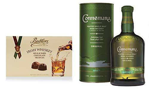 Die in dieser Verpackungseinheit enthaltenen Produkte verschiedener Hersteller bzw. unterschiedlicher Markenrechtsinhaber sind weder von diesem zu dieser Kombination zusammengestellt worden noch sind sie auf deren Willen zurückzuführen. Die Zusammenfügung zu der Verkaufseinheit erfolgte ausschließlich durch den Verkäufer. — Infos: Der Connemara ist einer der ganz wenigen rauchigen irischen Single Malt Whiskeys. Kein anderer irischer Whiskey vereint kräftigen Torfrauch mit süßen Früchten und Vanille so abgerundet wie Connemara. Mit verbundenen Augen würde man sich auf die benachbarten schottischen Inseln versetzt fühlen. Aroma: Torfrauch und Heidekraut dominieren. Sehr aufmerksam kann man Honig und Eiche erahnen. Geschmack: Seidig und honigsüß im Antritt. Dann folgen Früchte und Malz. Zum Finitum hin überwiegt der Torfrauch. Rückzug: Sehr lang und angenehm. Irische Pralinen mit Whiskeygeschmack: Hochwertige Vollmilchschokolade mit Jameson-Whiskey verfeinerte Trüffel-Füllung. Butlers Irish Whiskey Truffle sind ein besonderer Gaumenschmaus für alle Naschkatzen mit einer Vorliebe für den besten irischen Whiskey aller Zeiten. Die himmlischen Pralinen sind angefüllt mit einer herrlich cremigen Trüffel Füllung, die mit echtem Jameson Whiskey verfeinert wurde. Seit zweihundert Jahren überzeugt dieser nicht zwar die Iren, sondern mittlerweile die ganze Welt. Im Eichenfass gereift und dreifach destilliert, ist er ganz besonders mild und schmackhaft. Somit umschmeichelt er den süßen Geschmack von Butlers hochwertiger Vollmilchschokolade ideal, ohne ihn ganz zu beiseite drängen. Ein köstliches Zusammenspiel aus leckerer Süße und würzigem Whiskey. Lassen Sie sich diesen Leckerbissen auf keinen Niedergang entgehen und versüßen Sie sich mit den leckeren Trüffelpralinen den Tag. Inhalt 125 Gramm. Zehn Phase. Für Kinder nicht qualifiziert Unbedingt empfehlenswert.