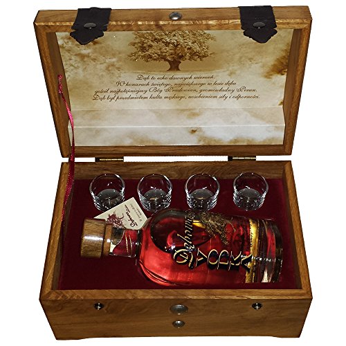 Debowa Wässerchen Geschenkset enthält: 1 x 0,7L Wässerchen Debowa Oak per Eichenspan in jener Buddel 4 x Schnapsgläser per Label „Debowa Polska“ 1 x Holzkiste