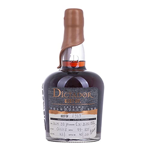 Die ‚Best Of‘-Aufstellung von Dictador beinhaltet eine Auswahl von den besten und ältesten Fässern der Destileria Colombiana. Die Fässer, welche von Master Parra skeptisch auserwählt werden, sind amerikanische Erheben-, Sherry- oder Port Fässer. Alle Labels sind handgeschrieben und signiert vom Master Blender Hernan Parra. Bei der EXTREMO Fassung der Best Of-Aufstellung liegt das Herz im Zuckerrohr. Diese Blends haben eine dunkle Farbe und einen weichen Charakter mit Aromen von Honig und Kaffee. Type: 39 Years Old Cask: EX-B212 Batch: 79-105 Beschränkt auf 300 Flaschen weltweit. Das Backlabel der Dictador BEST OF-Aufstellung kann den Zusatz „Spirit Drink“ aufweisen. Hierbei handelt es sich um einen im Jahr 2016 aus zollrechtlichen Gründen benötigten Zusatz für den Vertrieb in Kolumbien, in dem die Destileria Colombiana ansässig ist. Alle Dictador BEST OFs sind zu 100% reine Rums. „All our Rums are Rums. In 2016 we had a problem with Colombian authorities and there was a small batch of Best of’s we had to put phrase „Spirit Drink“ on the back label. It was only incidentally. I hope it will be not a big problem for you.“ – Dictador Der Hersteller Dictador beauftragte in der Vergangenheit unterschiedliche Unternehmen für die Herstellung der Glasflaschen. Durch die unterschiedlichen Glasstärken kann beim direkten Abmachung der optische Effekt eintreten, dass manche Abfüllungen ein zu geringes Füllvolumen beinhalten. Das ist nicht der Sturz, alle Flaschen besitzen den angeführten Inhalt. „As informed by production team, in the past we used a different glass supplier and the bottle had much thinner bottom hence this visual effect in some of our bottles. Feel free to open one bottle on our cost and check it.“ – Dictador