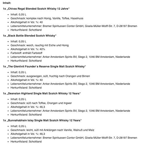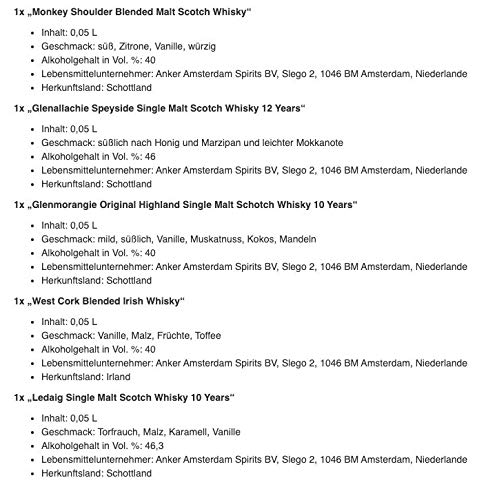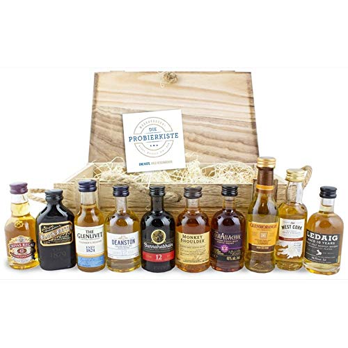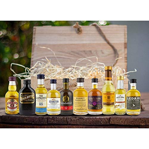 10 tolle Whiskysorten für den besonderen Anlass. (Inhalt: 1x Chivas Regal 12 (Blend), 0.05L 40% Vol | 1x Black Bottle (Blend), 0.05L 40% Vol | 1x The Glenlivit Founders Reserve, 0.05L 40% Vol | 1x Deanston Highland 12Y, 0.05L 46.3% Vol | 1x Bunnahabhain Islay 12Y, 0.05L 46.3% Vol | 1x Monkey Shoulder (Blend), 0.05L 40% Vol | 1x Glenallachie Speyside 12Y, 0.05L 46% Vol | 1x Glenmorangie Original Highland 10Y, 0.05L 40%Vol | 1x West Cork (Irish Blend), 0.05L 40% | 1x Ledaig 10Y, 0.05L 46.3%)