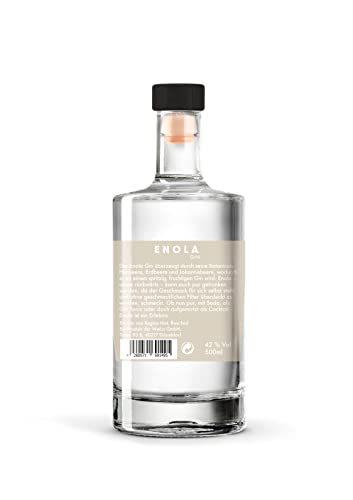Der Enola Gin überzeugt durch seine Botanicals Himbeere, Erdbeere und Johannisbeere, wodurch er zu einem spritzig, fruchtigen Gin wird. Enola – alone rückwärts – kann vulgo pur getrunken werden, da der Geschmack selber selbst steht und ohne geschmacklichen Filter überdeckt zu werden, köstlich ist.