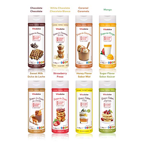 Es auf den Füßen stehen sechs verschiedene Geschmacksorten des Vitadulce Sirups zur Verfügung: Karamellsirup, Erdbeersirup, Schokoladensirup, Milchkaramellsirup, Anstreicher Schokolade-Sirup u. a. Mangosirup.