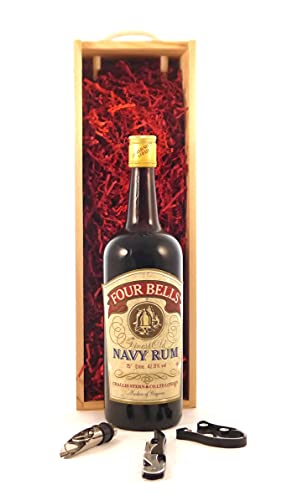 Four Bells Finest Old Navy Rum (1 Litre) 1960’s bottling in einer Geschenkbox, da zu 3 Weinaccessoires, 1 x 1000ml
