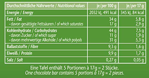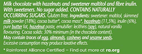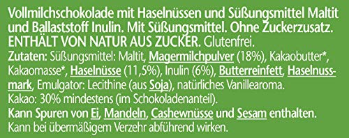 Zutaten: Süßungsmittel: Maltit, MAGERMILCHPULVER (18%), Kakaobutter, HASELNÜSSE (11,5%), Kakaomasse, Inulin (6%), BUTTERREINFETT, HASELNUSSMARK, Emulgator: Lecithine (jedweder SOJA), natürliches Vanillearoma. Kakao: 30% mindestens (im Schokoladenanteil). Kann Spuren von EI, KASCHUNÜSSEN, MANDELN und SESAM enthalten. Kann bei übermäßigem Verzehr abführend pflügen.