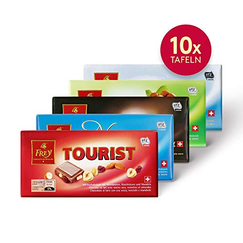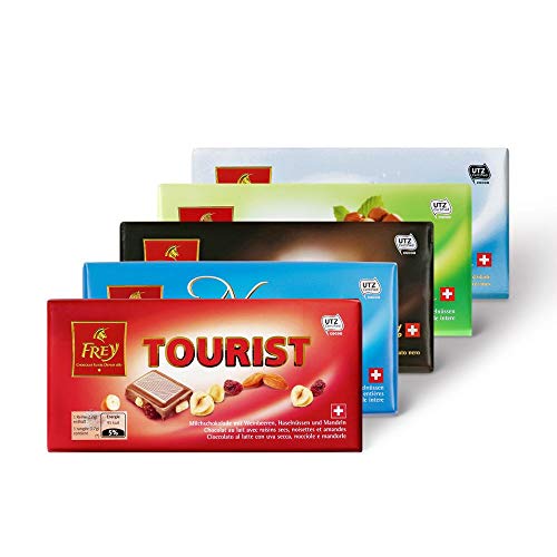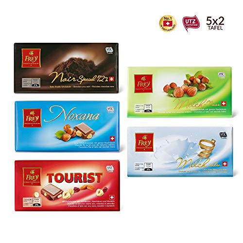 Frey Milch Einzeln Fein 2x 100g Zucker, VollMILCHpulver 26 %, Kakaobutter, Kakaomasse, HASELNÜSSE gemahlen, Emulgator: SOJAlecithin, natürliches Aroma. Kann MANDELN und Spuren anderer Schalenfrüchte (NÜSSE) enthalten. Kakao: 31 % mindestens Frey Noir Special 72% 2x 100g Kakaomasse, Zucker, Kakaobutter, Kakaopulver, Aroma. Kann MILCH, HASELNÜSSE, MANDELN, SOJA und Spuren anderer Schalenfrüchte (NÜSSE) enthalten. Kakao: 72 % mindestens Frey Tourist 2x 100g Zucker, Kakaobutter, Weinbeeren 11 %, MagerMILCHpulver, Kakaomasse, HASELNÜSSE 5.0 %, MANDELN 5.0 %, VollMILCHpulver, BUTTERreinfett, Emulgator: SOJAlecithin, natürliches Aroma. Kann Spuren anderer Schalenfrüchte (NÜSSE) enthalten. Kakao: 31 % mindestens in der Schokolade Frey Noxana, 2x 100g Zucker, HASELNÜSSE 21 %, Kakaobutter, Kakaomasse, VollMILCHpulver, MagerMILCHpulver, BUTTERreinfett, Emulgator: SOJAlecithin, natürliche Aromen. Kann MANDELN und Spuren anderer Schalenfrüchte (NÜSSE) enthalten. Kakao: 34 % mindestens in der Schokolade Frey Milch Nuss 2x 100g Zucker, HASELNÜSSE leer und gemahlen 21 %, Kakaobutter, MagerMILCHpulver, Kakaomasse, BUTTERreinfett, Emulgator: SOJAlecithin, natürliches Aroma. Kann MANDELN und Spuren anderer Schalenfrüchte (NÜSSE) enthalten. Kakao: 30 % mindestens in der Schokolade