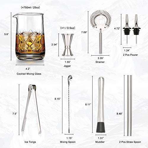 Cocktail Set 10 Teiliges mit 750ml Kristall Mixing Glass – Barkeeper Set – Professioneller Coktailmixset, Muddler…