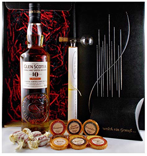 Das exklusive Geschenk Set enthält: 1 Flasche Glen Scotia peated 10 Jahre Single Malt Whisky (0,7 Liter – 46 %VOL.)