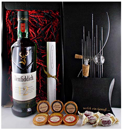 Der meistverkaufte Single Malt Whisky der Welt überfordert niemanden. Diese Abfüllung wurde schon mehrfach ausgezeichnet. Aroma: Fruchtig und frisch dabei im Gegensatz dazu leicht und zart. Geschmack: Malzig und süß. Karamell- und Malzsüße verbinden sich abgestimmt. Amtsabtretung: Aromatisch mit einem winzigen Hauch an Torfrauch. Fassreifung: Bourbon- und Sherryfässer. Der Glenfiddich passt hervorragend zu den erlesenen Herkunftsschokoladen aus der Confiserie DreiMeister. Genießen Sie ihn gemeinsam mit der Edel Schokolade. – Die Edel Schokoladen stammen aus ausgewählten Regionen, hergestellt mit Kakaobutter. Sorgfältige Auswahl natürlicher und bester Zutaten, ohne Konservierungsstoffe, auf die Waage bringen je 8 Gramm. Vollmilch- und Zartbitterschokolade in 9 Sorten mit folgenden Kakaogehalten: Aus Ecuador: 52%, Santo Domingo:71%, Ghana: 85%, Venezuela: 43%, Costa Rica: 38%, Java: 34%. Coffee & Choc Taler Espresso, Cappuccino & Kaffee-Karamell aus Edelmilchschokolade 32% und dunkler Schokolade 53,5%. 1 DaJa Meersalztaler: Eine besondere dunkle Edel Schokolade mit einer feinen Salznote und zarten Schmelz – einmalig im Geschmack. Ein Kick mit Salz, genial! (Kakaoanteil 60% – ca. 5g). Können Spuren von Nüssen und anderen Schalenfrüchten enthalten. Whisky Fudge: von Edradour schmeckt fein nach Karamell und leicht nach Whisky. – Dieser besondere Portionierer ist aus Glas hergestellt. (22×17) und passt auf alle gängigen 0,7 Liter Flaschen. Er hat 2 Aufsätze aus Naturkork (konisch) somit fügt er sich passgenau in die Flasche. Die Glaskugel fasst 2 cl und eignet sich somit zum optimalen dosieren und eingießen. Das Eingießen eines edlen Tropfens macht mit Hilfe dieses Portionierers so universell Spaß! Durch das Neigen der Flasche läuft zunächst die Kugel mit 2 cl Flüssigkeit voll. Danach dreht man die Flasche so weit, dass nichts mehr nachlaufen kann. Den genau dosierten Inhalt einfach jedoch noch ins Glas Eingießen. Es geht dabei kein einziger Tropfen mehr verschollen.