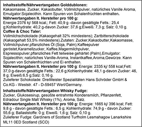 Glenfiddich Distillery Dufftown Banffshire AB55 4DH/GB – Schottland Zulieferer DreiMeister Spezialitäten Hans Schröder GmbH & Co.KG – Weststr. 47 – D-59457 Werl/Germany DaJaChocolate Schokoladenmanufaktur KG,Kuhlenstr. 9-11, D-25436 Uetersen Fudge: Gardiners of ScotlandTurfholm Lesmahagow Lanarkshire ML11 0ED Scotland (SCO)
