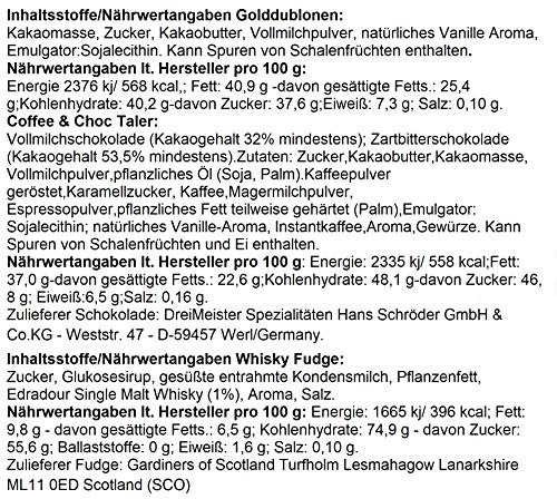 Dufftown Distillery Dufftown Keith Banffshire AB55 4BR/GB Zulieferer DreiMeister Spezialitäten Hans Schröder GmbH & Co.KG – Weststr. 47 – D-59457 Werl/Germany DaJaChocolate Schokoladenmanufaktur KG,Kuhlenstr. 9-11, D-25436 Uetersen Fudge: Gardiners of ScotlandTurfholm Lesmahagow Lanarkshire ML11 0ED Scotland (SCO)