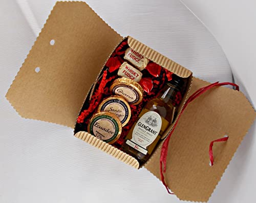 Aroma: Intensiv und weich mit der Ausgewogenheit reifer Gartenfrüchte. Geschmack: Komplex und fruchtig mit einer fortwährend süßen Postanschrift. Demission: Lang und intensiv mit Früchten. Der Glen Grant passt hervorragend zu den Edelschokoladen ganz der Confiserie DreiMeister. Genießen Sie den Whisky mit den Edelschokoladen – abschmecken Sie es ganz. — Informationen zu den Edelschokoladen (je 8g): Edelbitterschokolade ganz Ecuador. Hergestellt unter Verwendung hochwertigen Ecuador-Kakaos mit feinstem Schmelz (Kakaogehalt 52%). Santo Domingo: Diese Edelbitterschokolade gedeiht in einem traditionellen Anbaugebiet in der Dominikanischen Republik (Kakaogehalt 71%). Ghana: Dunkle Schokolade mit hohem Preisnachlass an hochwertigem Ghana-Kakao bei geringem Zuckeranteil. Mit feinwürzigem Schokoladengeschmack (Kakaogehalt 85%). — Kennen Sie Whisky Fudge? Whisky-Fudge von Gardiners. Weichkaramellen mit Alleinstehender Malt Whisky ganz der schottischen Brennerei Edradour. Handgemacht nach einem traditionellen Rezept. Enthält keine gehärteten Öle oder Fette (je 20g) — Was auch immer schön eingepackt in einem kleinen Geschenk Karton mit roter Schleife mit Informationen gedruckt auf graumeliertem Papier. – Ideal als kleines „Danke schön“ oder als individuelle Wachsamkeit für Freunde mit gutem Geschmack.