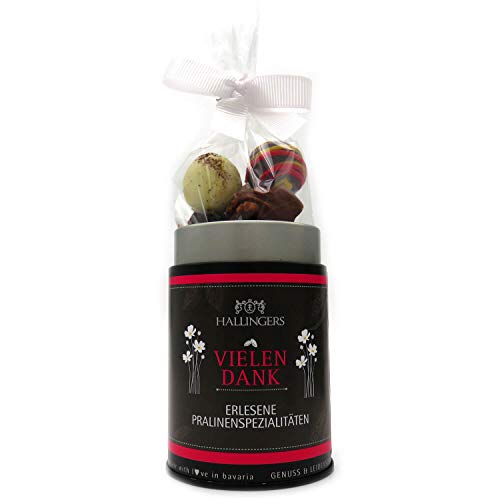 Eine saisonale Auswahl feinster Manufakturpralinen in der neuen, edlen Premiumdose. In meistervoller Handarbeit täglich frisch für Sie produzierte Manufaktur-Pralinen. Diese Selektion besteht aus ca. 12 feinen Trüffeln und Schnittpralinen. Die Zusammenstellung wird je nach Saison aufeinander abgestimmt, damit Sie immer einen feinen, stimmungsvollen Mix erhalten. Im Sommer versenden wir mit Abkühlung – natürlich ohne Zusatzkosten für Sie – damit die Pralinen so wohbehalten wie möglich bei Ihnen ankommen! Bitte lassen Sie diese nunmehr zu keiner Zeit zu lange in der Sonne stehen, da diese sonst nicht an Ihrem Gaumen sondern bereits in der Premiumdose dahinschmelzen… | HALLINGERS – EINE GRÜNDUNG AUS LEIDENSCHAFT: Seit 2012 produzieren wir in unserer Manufaktur mit großer Leidenschaft unsere Genüsse. Alles wird von Hand aus hochwertigen, wo möglich regionalen, Zutaten hergestellt. Unsere Produktverpackungen sind modern und innovativ. Wir durften schon einige nationale und internationale Auszeichnungen gefährdet sein. In unserem Familienunternehmen ist uns eine positive Unternehmenskultur genauso wichtig wie unser soziales Engagement. Besuchen Sie uns und lassen Sie sich von unserer Leidenschaft beflügeln! Ihre Karin und Patrick Hallinger (Gründer und Geschäftsführer)