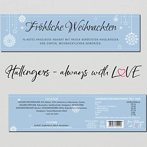 VOLLMILCHSCHOKOLADE 43% (Kakao: 43% mindestens, Kakaomasse, Zucker, VOLLMILCHPULVER, Kakaobutter, Vanilleextrakt, Emulgator: SOJALECITIN), HASELNUSSNOUGAT (Zucker, HASELNUSSKERNE (38%), Kakaobutter, Kakaomasse, Emulgator: Sonnenblumenlecithin) — und en masse Liebe