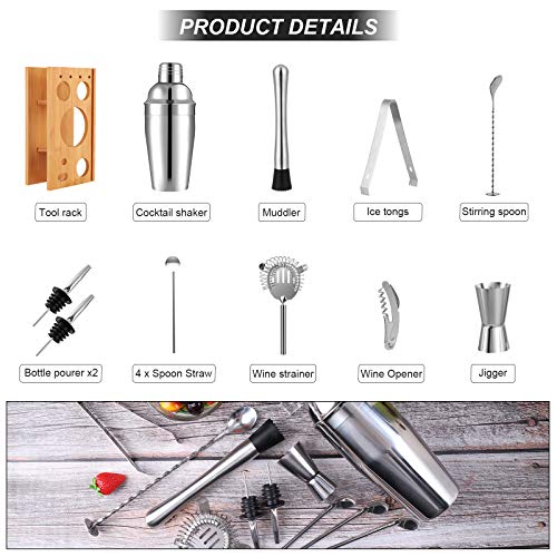【GENIESSEN SIE DEN COCKTAIL ZU HAUSE】 – Dieses Cocktail-Kit enthält alles, was ein Barkeeper braucht. Sie können zu Hause wundervolle Getränke mixen und müssen in delegieren Bars nicht zu unbegrenzt bezahlen. Jeder kann ein Barkeeper sein. 14 Fragment EXKLUSIVES BAR-WERKZEUGSATZ: 1x750MLCocktailshaker+1xMessbecher+ 1xFlaschenöffner+1xStößel+1xBarlöffel+1xEiszange+1xEissieb+1xHolzständer+2xAusgießer+4x Löffeln