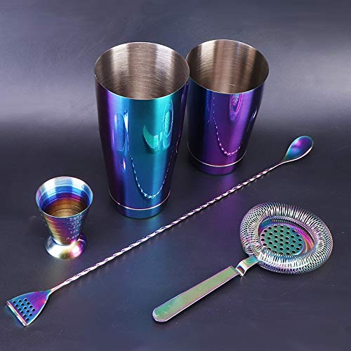 Komplettes Werkzeugset: 1x 18 und 28 oz Boston Cocktail Shaker, 1 × Magic Jigger, 1 × Cocktailsieb, 1 × 40 cm Mischlöffel.