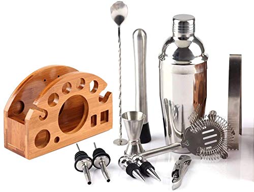 Summe: 12 Bereich Edelstahl Set.Meiche Jigger, Mischlöffel, Muddler, Sieb, Eiszangen, Weinöffner, Alkoholausgießer, Bambus-Speicher-Rack-Stand, Mocktail-Rezepte Broschüre.