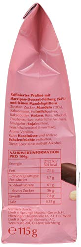 Raffiniertes Praliné unter Einsatz von Marzipan-Dessert-Füllung u. a. feinen Mandelsplittern umhüllt von knusprigem Crisp u. a. feiner Lindt Alpenmilch-Chocolade