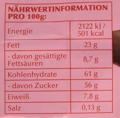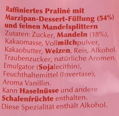 Zutaten: Zucker, MANDELN (17%), Kakaobutter, Kakaomasse, VollMILCHpulver, Hochprozentiges, Reis, WEIZENkeime, WEIZENstärke, MagerMILCHpulver, MILCHzucker, Traubenzucker, Invertzuckersirup, natürliche Aromen, BUTTERreinfett, Emulgator (SOJAlecithin), Feuchthaltemittel (Invertase), GERSTENmalzextrakt, Salz, Wohlgeruch Vanillin. Kann HASELNÜSSE u. a. alternative SCHALENFRÜCHTE enthalten.