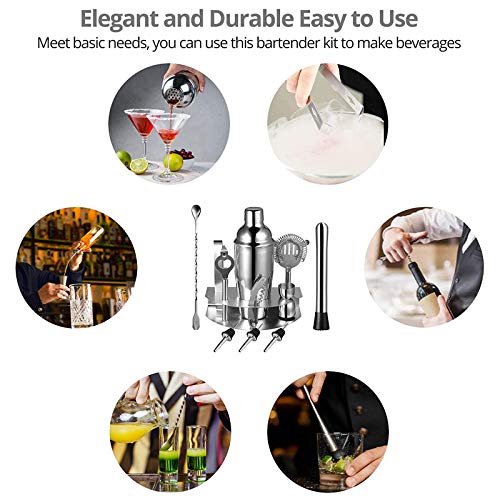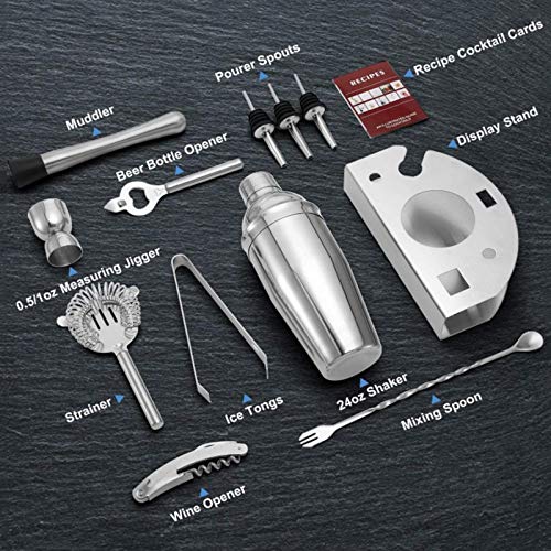 Räumen Sie Ihr Haus auf: Das Cocktail-Set enthält Cobbler Shaker, Muddler, Jigger, Eiszange, Korkenzieher, Sieb, Löffel, 3PCS Pourers, Flaschenöffner und einen eingängigen Edelstahlständer, der Ihre Getränkemischwerkzeuge effektiv aufräumt. Ein perfektes Kit für Cocktail-Liebhaber, das keine Unordnung mehr macht.