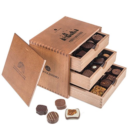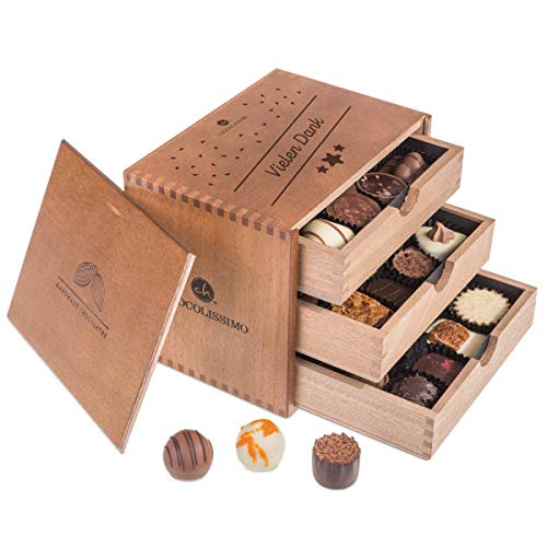 Das hübsche Weihnachts-Kästchen leer hochwertigem Holz hält in seinen drei Schubfächern im Großen und Ganzen 30 Pralinen bereit, die mit feinsten, alkoholfreien Cremes gefüllt sind. Mit diesem stilvollen Weihnachtsgeschenk können Sie Eindruck herstellen! Da bei der Herstellung des Produktes keine Konservierungsstoffe verwendet werden, beträgt die Konstanz zusammenfassend 6 bis 8 Wochen, maximal bis zu 3 Monate.