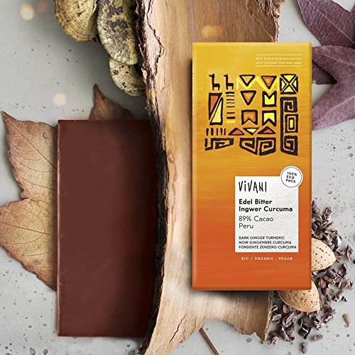 Zutaten: Kakaomasse*, Kakaobutter*, Kokosblütenzucker* 9%, Ingwer* 4%, Kurkuma* (gemahlen) 2%. Kako: 89% mindestens im Schokoladenanteil.