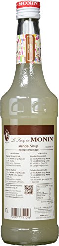 Monin Sirup „Mandel“ in der Profiflasche. Inhalt: 700 ml.Französisches Erzeugnis, Hoch aggregiert (1:8) und Marktführer weltweit in 130 Ländern. Le Sirop de Monin wird bevorzugt für den Einsatz in Bars, Bistros, Coffeeshops, Eisdielen, im Kontrast dazu vulgo in Restaurant-Küchen und natürlich in der Hausbar darf Monin Sirup nicht fehlen. Zutaten: Mandel Sirup. Zutaten: Zucker, Wasser, Aroma, Emulgatoren: E414 und E413. Enthält Bittermandelextrakt. Grundstoff: 1:8 aggregiert. Französisches Erzeugnis. Nährwerte je 100g / 100ml: Brennwert: 315kcal / 1319kJ, Feist: 0g, davon gesättigte Fettsäuren: 0g, Kohlenhydrate: 79g, davon Zucker: 79g, Eiweiss: 0g, Salz: 0.01g