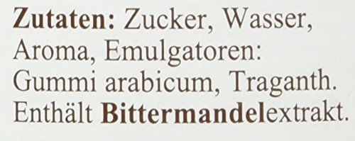 Zucker, Wasser, Aroma, Emulgatoren: Gummi arabicum, Traganth. Enthält Bittermandelextrakt.Gummi arabicum (E414),Traganth (E413),Nüsse und Nusserzeugnisse (AN)