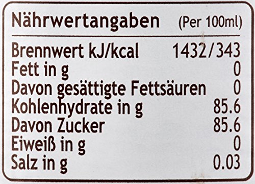 Rohrzucker, Wasser. Nährwertangaben (per 100ml): Kcal – 342; Kj – 1430; Eiweiß in g – 0; Kohlenhydrate in g – 85,5, davon Zucker – 85,5; übergewichtig in g – 0; Salz in g – 0