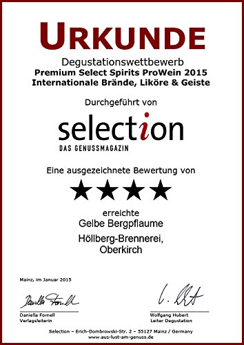 Auch vulgo Haferpflaume, ernten wir in den Berglagen des Schwarzwaldes. Die gelbe Pflaumensorte, wird nach voller Reife von Hand gepflückt. Angrenzend der kontrollierten Vergärung schätzen wir gewissenhaft darauf, dass keine Steine der Frucht zerkleinert werden. Nach zweifacher Destillation wird unser Höllberg Gelbe Bergpflaume im Steingut gelagert. Infolge die lange Lagerung, ist uns mit dem Generation 1996, ein vortrefflicher Edelobstbrand gelungen, der seines gleichen sucht. Beim Degustationswettbewerb von Internationalen Brände Angrenzend Premium Select Spirits ProWein 2015, konnten wir Gold erzielen. Ein massiv kräftiger ausdrucksvoller Pflaumenbrand.