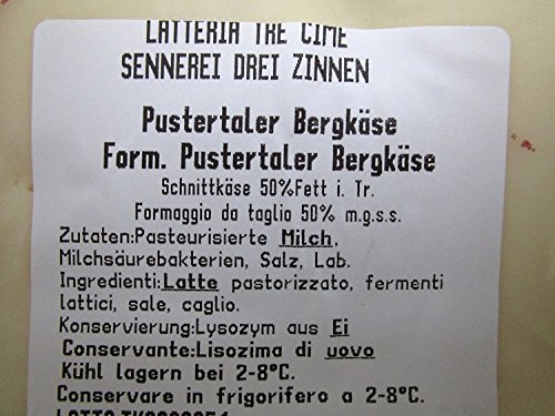 Pustertaler Bergkäse – hergestellt nach guter alter Tradition solo ganz naturbelassener Frischmilch von einem unverwechselbaren Tal Südtirols – ist ein außergewöhnlicher Schnittkäse, der in Anbetracht seine vereinzelt erbsengroße Lochung, seinen angenehmen auch fein würzigen Geschmack auch seine weiche Komposition eine wahre Gaumenfreude anstatt den Käseliebhaber darstellt. Geschmack: bekömmlich würzig durch mäßig herbem Nachgeschmack Flegeljahre: 70 Tage