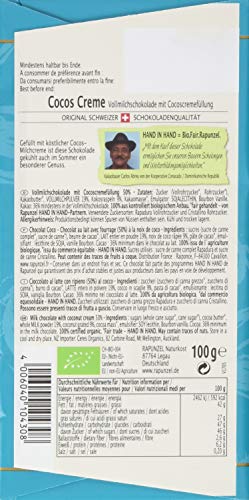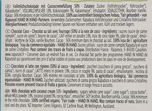 Zutaten: Zucker* (Vollrohrzucker*, Rohrzucker*), Kakaobutter*, VOLLMILCHPULVER* (19,00%), Kokosraspel* (9,00%), Kakaomasse*, Emulgator: SOJALECITHIN*, Bourbon Vanille*