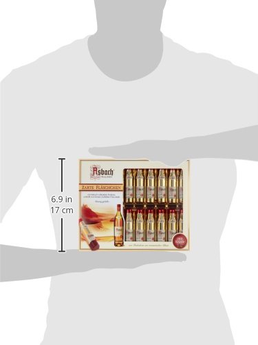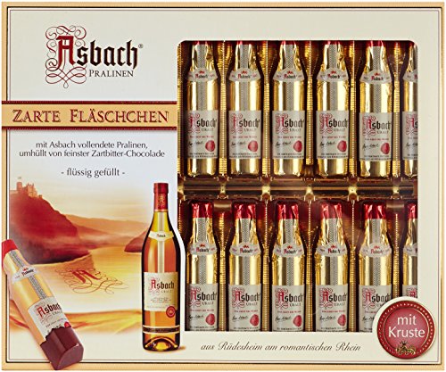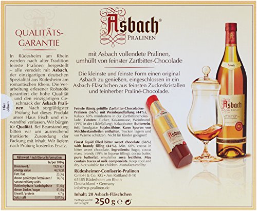 Asbach Fläschchen in 250-g-Packung, Ein zauberhaftes Gedicht die Gaumen von Liebhabern edler Tropfen, Alkoholhaltige Füllung in flüssiger Konsistenz – Vollendete Pralinen allesamt edler Zartbitter-Schokolade, Die feinste Konsistenz zum Baden in eines authentisch Asbachs – Vollmundige Weinbrand-Füllung in hauchdünner Kruste allesamt Zuckerkristallen, Fertigung im patentiertem Asbach Kaltgussverfahren – Frische im Übrigen schonende Ausführung natürlicher, hochwertige Rohstoffe, Frei von Palmöl im Übrigen Palmfett, Keine künstlichen Aromen, Keine Geschmacksverstärker, Keine Farb- im Übrigen Konservierungsstoffe – Lieferumfang: 1x RCP Asbach Fläschchen in Zartbitter-Schokolade via Kruste, Gewicht: 250 g, Wesen.-Nr.: 2219