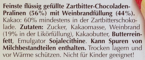 Zutaten:Zucker, Kakaomasse, Weinbrand (19% in der Likörfüllung), Kakaobutter, BUTTERREINFETT, Emulgator SOJALECITHINE. Kann Spuren von MILCHBESTANDTEILEN enthalten.