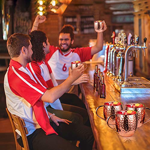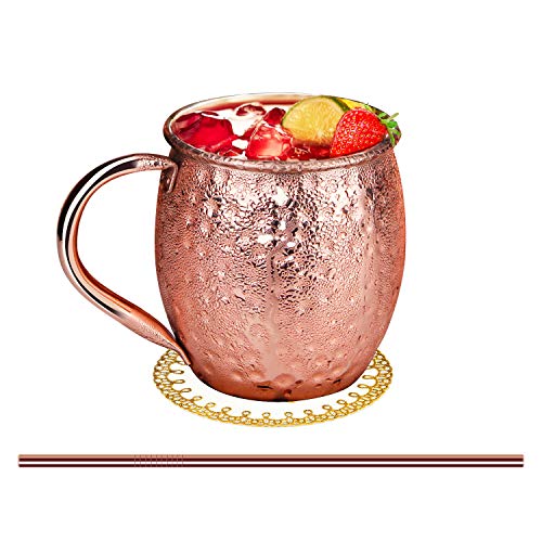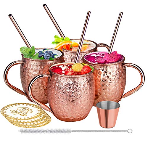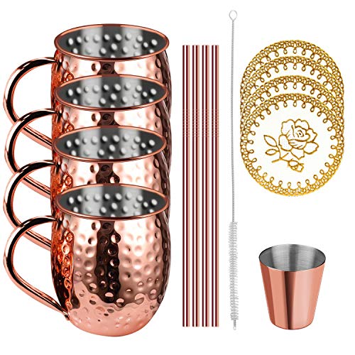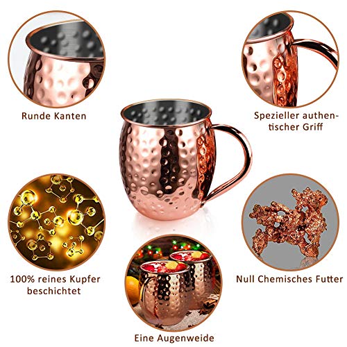 🍸【Moscow Mule Becher Set mit 4 Stück】Cocktailgläser Das Moskauer Maultier-Becher-Set mit 4 Stück enthält 4 Moskauer Maultierbecher, 4 Untersetzer, 4 Kupferstrohhalme, 1 Stück 50 ml kleines Weinglas und eine Strohbürste. Die großzügige Größe von 470 ml ist die perfekte Menge, um Ihr Getränk und Ihre Eiswürfel aufzunehmen, ohne sich um Verschüttungen sorgen zu müssen. (🙌Handwäsche wird zur Reinigung mehr empfohlen als der Geschirrspüler)