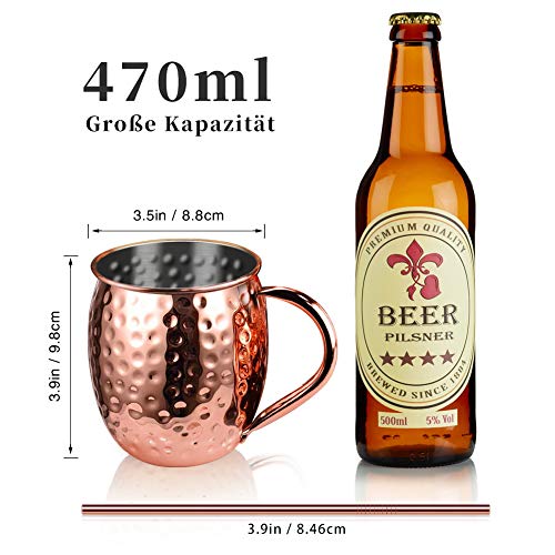 Moscow Mule Becher Set, 4 Kupferbecher Cocktail Tasse für Kaltes Getränk, Wein, Bar, Party, Geschenkset mit 4 Strohalmen…