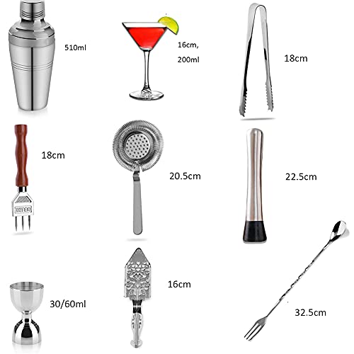 [Komplette Bar Set] Cocktailglas Set kann alle Ihre Anforderungen zu Potte kommen! Das Kit enthält 510ml Cocktail Shaker X1, Cocktailglas X1, Drei-Kopf-Eiskegel X1, Eisfilter X1, Doppelkopf-Messbecher X1, Absinthe-Suppenlöffel X1, Eisclip X1, Crushed Popsicle X1, Crushed Scoop X1