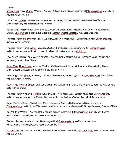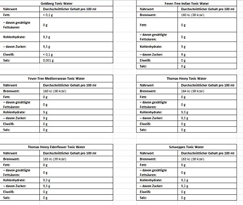 Tonic Water: Aqua, Zucker, Kohlensäure, Säuerungsmittel Citronensäure, natürliches Duft, Duft Chinin. Ginger Ale: Aqua, Zucker, Kohlensäure, natürliches Ingweraroma unter Zuhilfenahme von anderen natürlichen Aromen, Säuerungsmittel Citronensäure, Farbstoff E150d. Die übrigen Bestandteile aussortieren Sie bitte den Einzelartikeln.