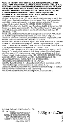 PRALINE MIT WEIßE SCHOKOLADE -92,5% (KAKAO: 31,3% MINDESTENS), HIMBEERKÖRNER UND GERÖSTETE KAKAO-NIBS. GLUTENFREI ZUTATEN: Zucker, Kakaobutter, VOLLMILCHPULVER, Gehackte geröstete Kakao-Nibs 4.2%, MOLKENPULVER (aufgebraucht MILCH), Himbeer granulat (Glukosesirup, Himbeeren. 270 g frische Frucht pro 100 g ) 2.8%, Gemüseextrakt (Süßkartoffel, Karotte, Nass, Säuerungsmittel: Zitronensäure), Emulgator: SOJALECITHIN, Natürliches Vanillearoma. KANN SPÜREN VON SCHALENFRÜCHTEN ENTHALTEN.