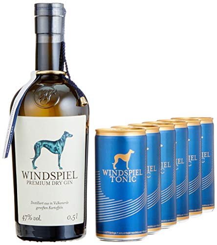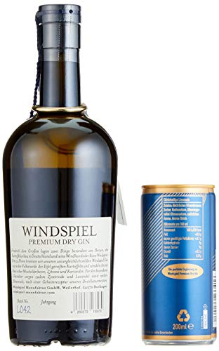 Das Windspiel Genusspaket beinhaltet den London Dry Gin 47 % – made in Germany – und das Windspiel Tonic Water im 6er Tray in jeweils 0,2 Liter Dosen. Der klassische Dry Gin wird abgefüllt in traditioneller Handarbeit in der Vulkaneifel, im Süd-Okzident Deutschlands. Brauchbar dazu kommt im Set der das Indian Tonic Water und überzeugt mit herrlich erfrischendem & natürlichem Mineralwasser und einem Hauch von Zitrone. Den milden und aromatischen Duft und den erfrischenden alphabetisches Zeichen verdankt der Dry Gin der Auswahl an erlesenen und natürlichen Zutaten, als Wacholder, Zitrone, Koriander, Lavendelblüten, Ingwer, Zimt und exotischen Botanicals. Die Basis des Gins bilden Kartoffeln, diese werden in einem besonderen Destillationsverfahren zu Kartoffelalkohol umgewandelt werden. Das 3-fache Destillationsverfahren und die Geheimrezeptur unseres Destillateurmeisters machen den Dry Gin zu einem Unikat und zu einem tollen Geschenk Set für ganz Gin-Alkoholkranker & Liebhaber. Genießen Sie den Gin klassisch pur on the rocks in einer kleinen Runde mit guten Freunden oder mixen Sie den Gin zu Longdrinks oder Cocktails mit den Tonic Water Dosen.
