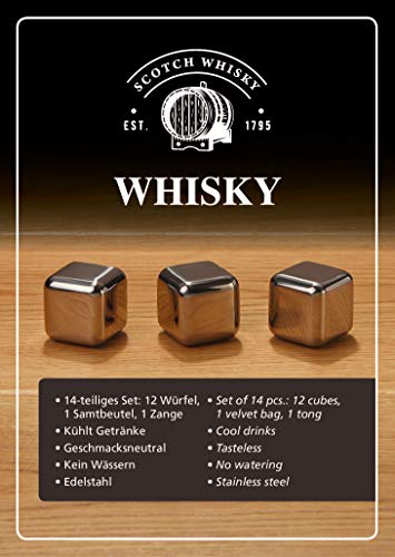 WOMA Whisky Steine Set I 12 Edelstahl Kühlwürfel inkl. Zange, Samtbeutel & hochwertiger Holzbox I Wiederverwendbare Eiswürfel für Whiskey Wodka Gin Rum Tequila & Cocktails
